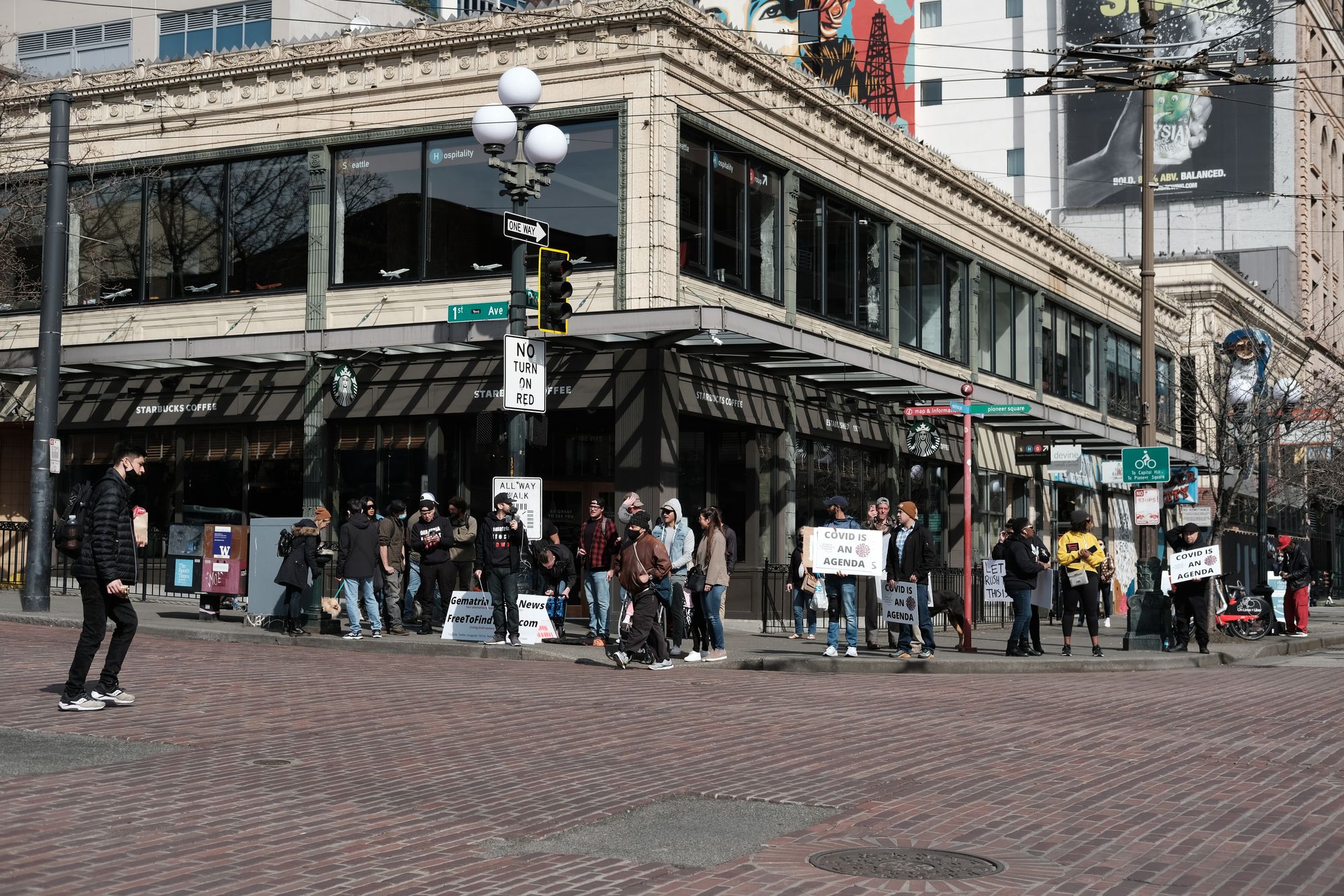 There's the main intersection at Pike Place Market. Starbucks, The Showbox, and the iconic Pike Place Market sign. It's a great place for proselytizers and protesters. Today there were two men bullhorning the need to repent and refrain from demonic speech on one corner. Across from them were the sign-wielding, maskless "COVID is an agenda" folks. I got out of there pretty quickly.