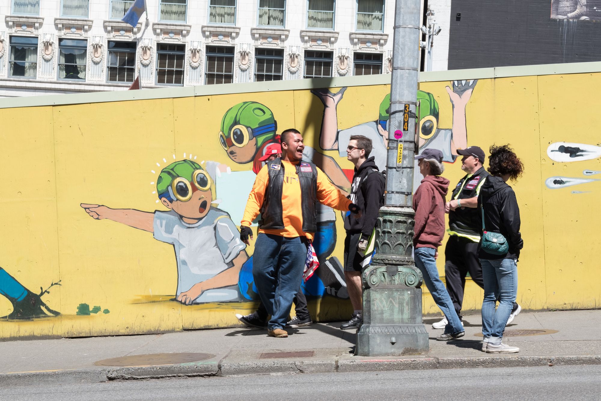 I took some photos. I can't remember if I posted them to my old site. I stumbled on the photos tonight, and I spent a lot of time thinking about them. I'd forgotten about the photos and the palpable anger. I'd also forgotten about the backdrop - comic book-like characters painted on construction walls who seemed intimately involved.