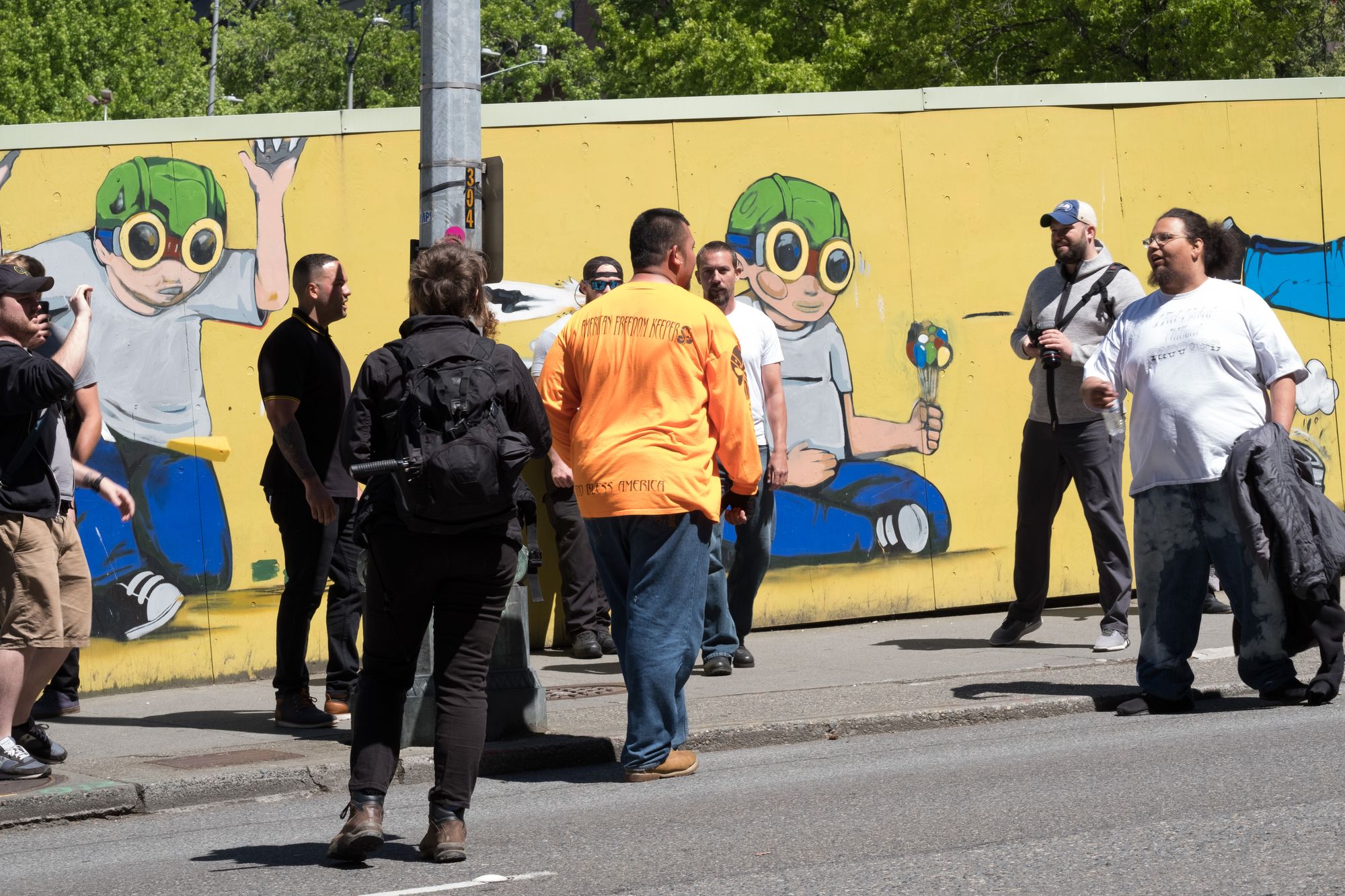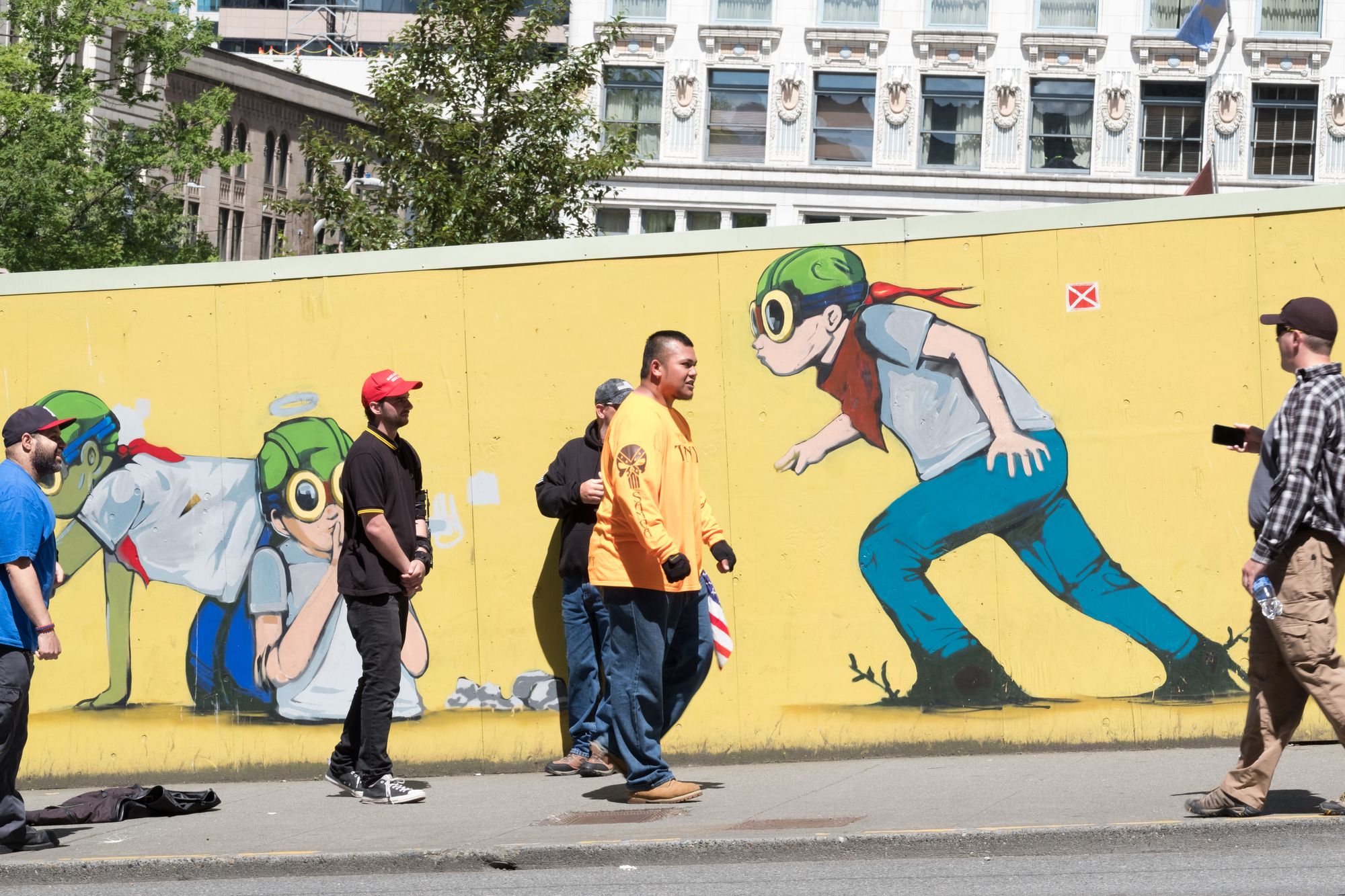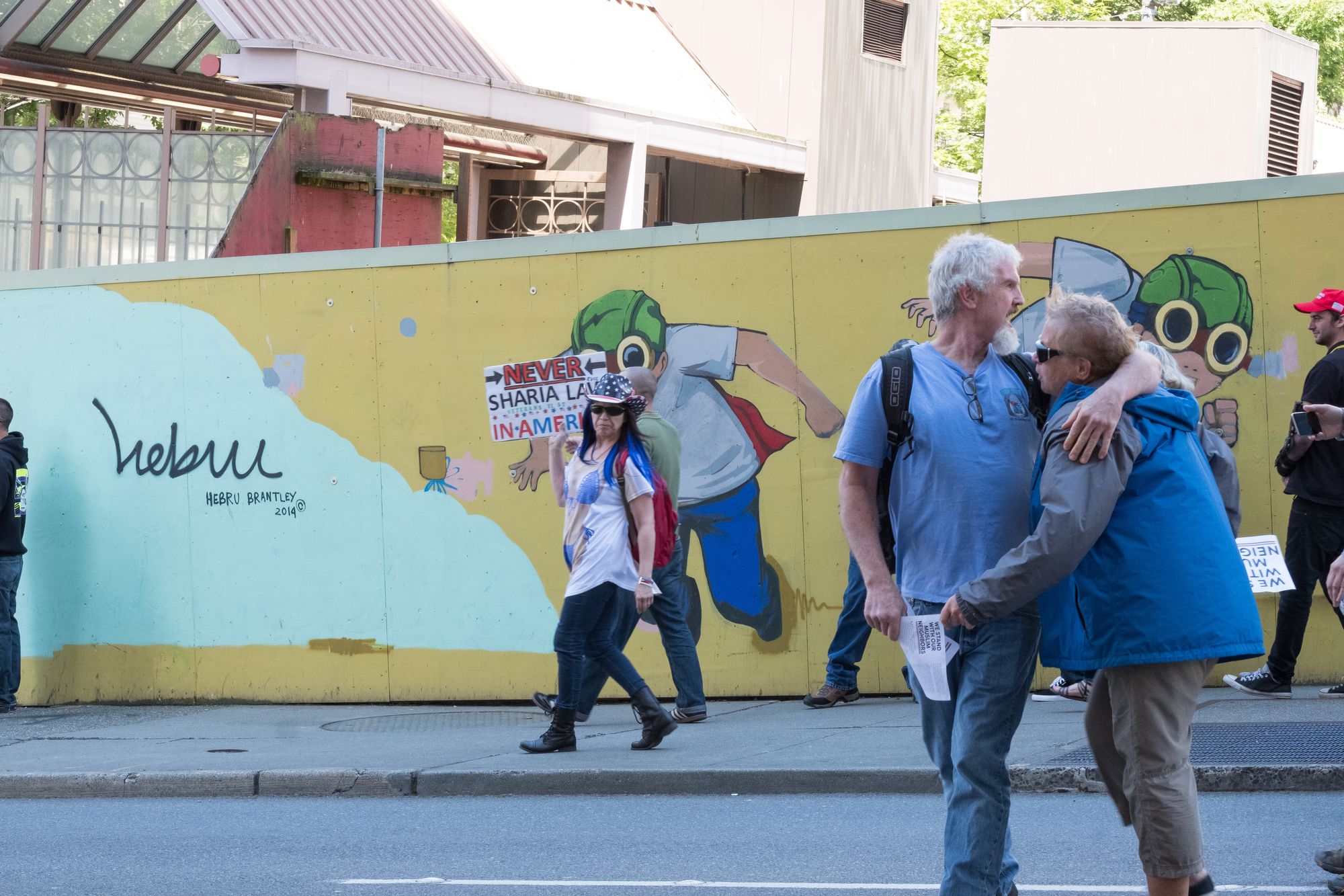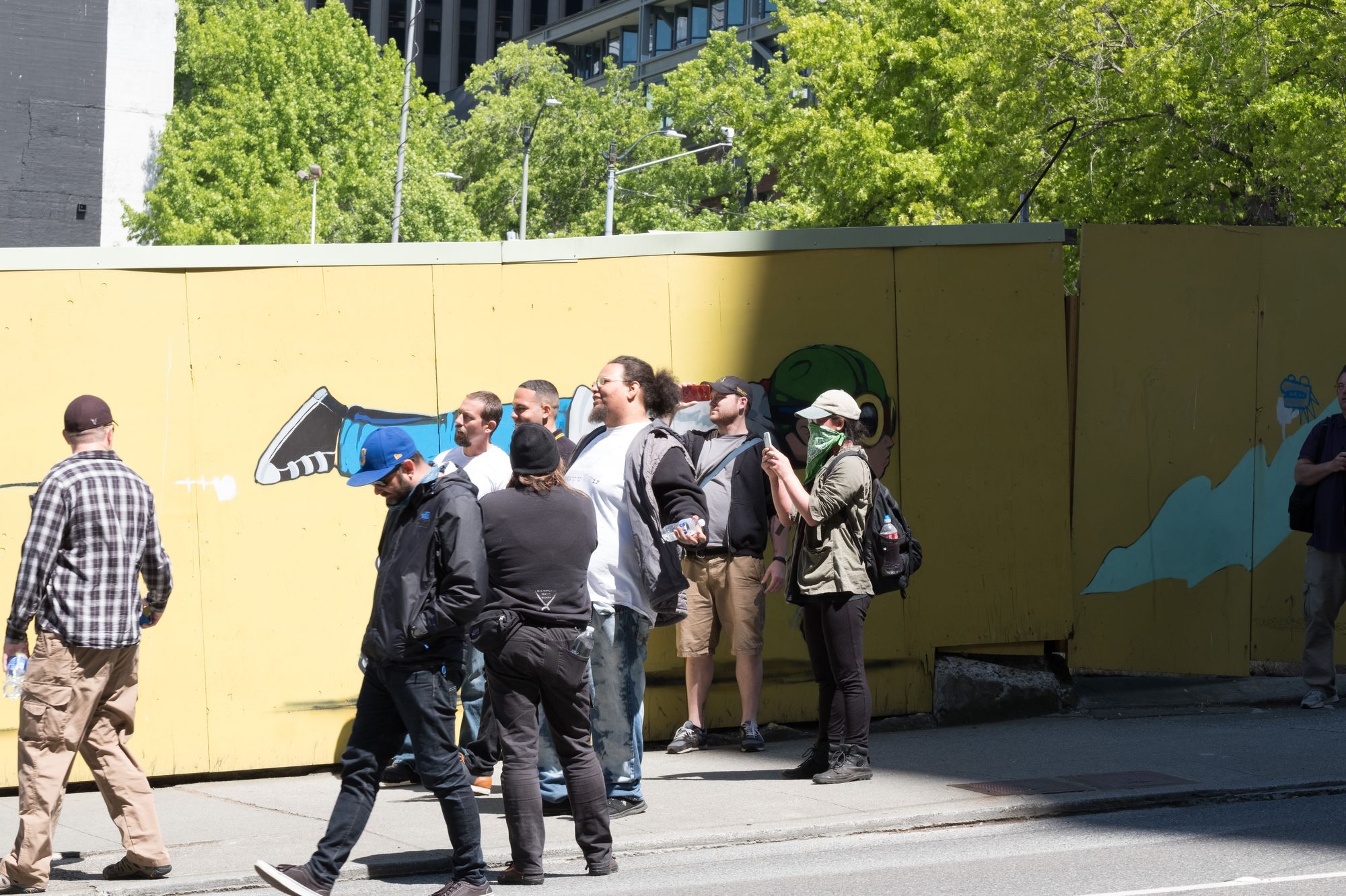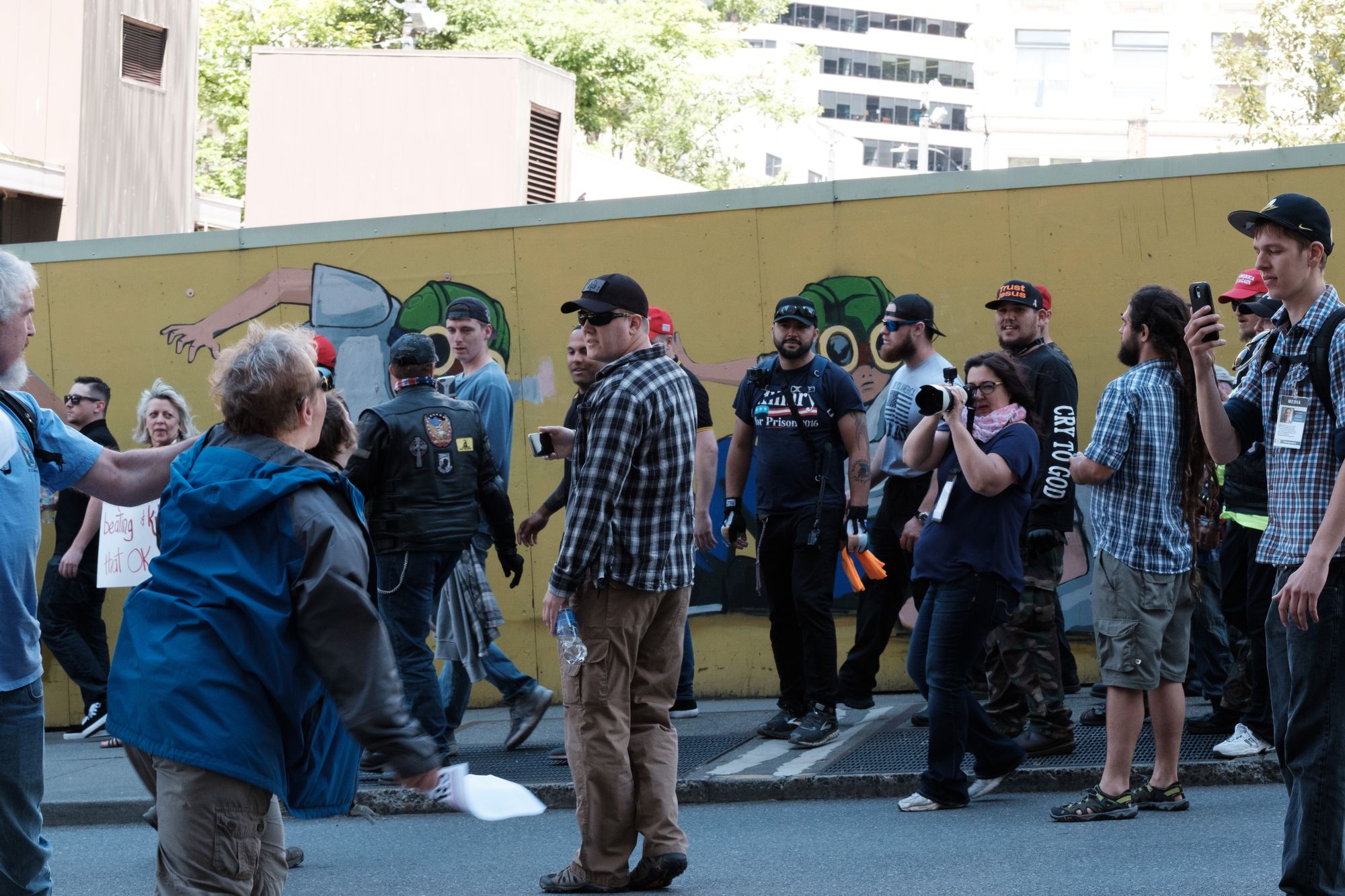 In June 2017 I took photos at a protest in Seattle. I can't remember the details, but I think it was a protest / counter-protest partially centered on a travel ban. Proud Boys and other pro-Trump groups were protesting in downtown Seattle, and counter-protesters gathered in response. There were a lot of pro- and anti-Islam signs.