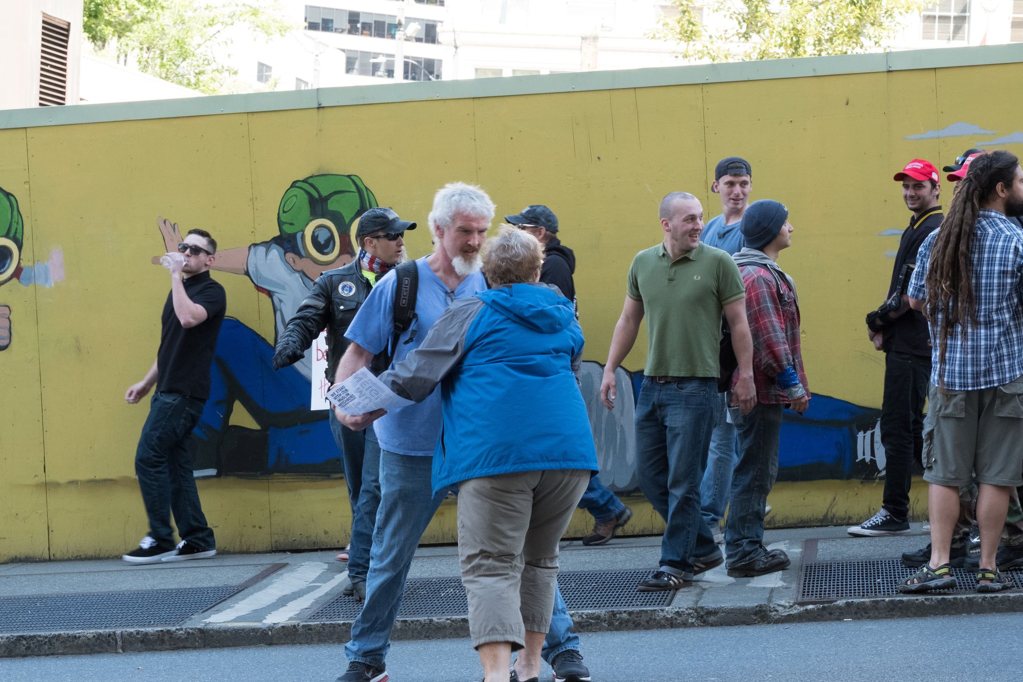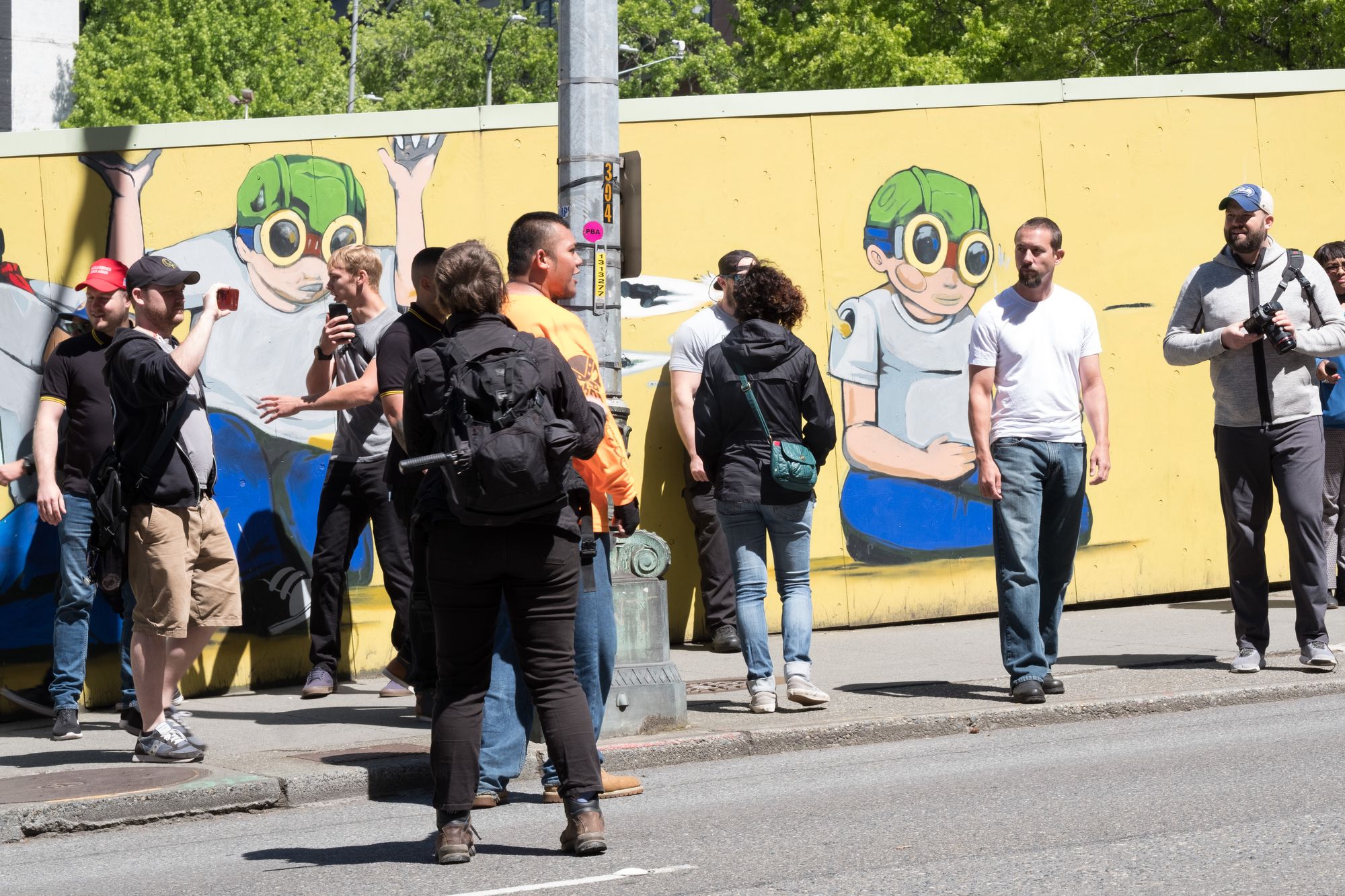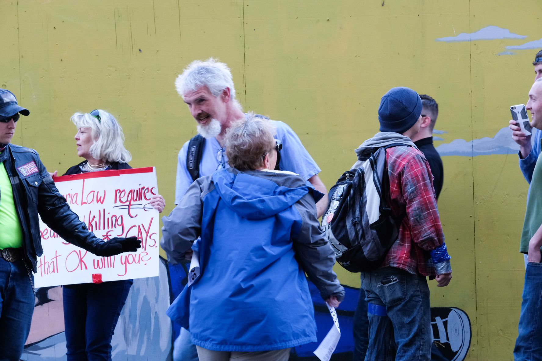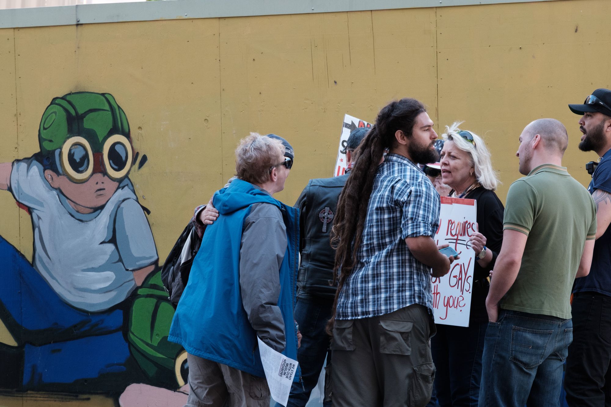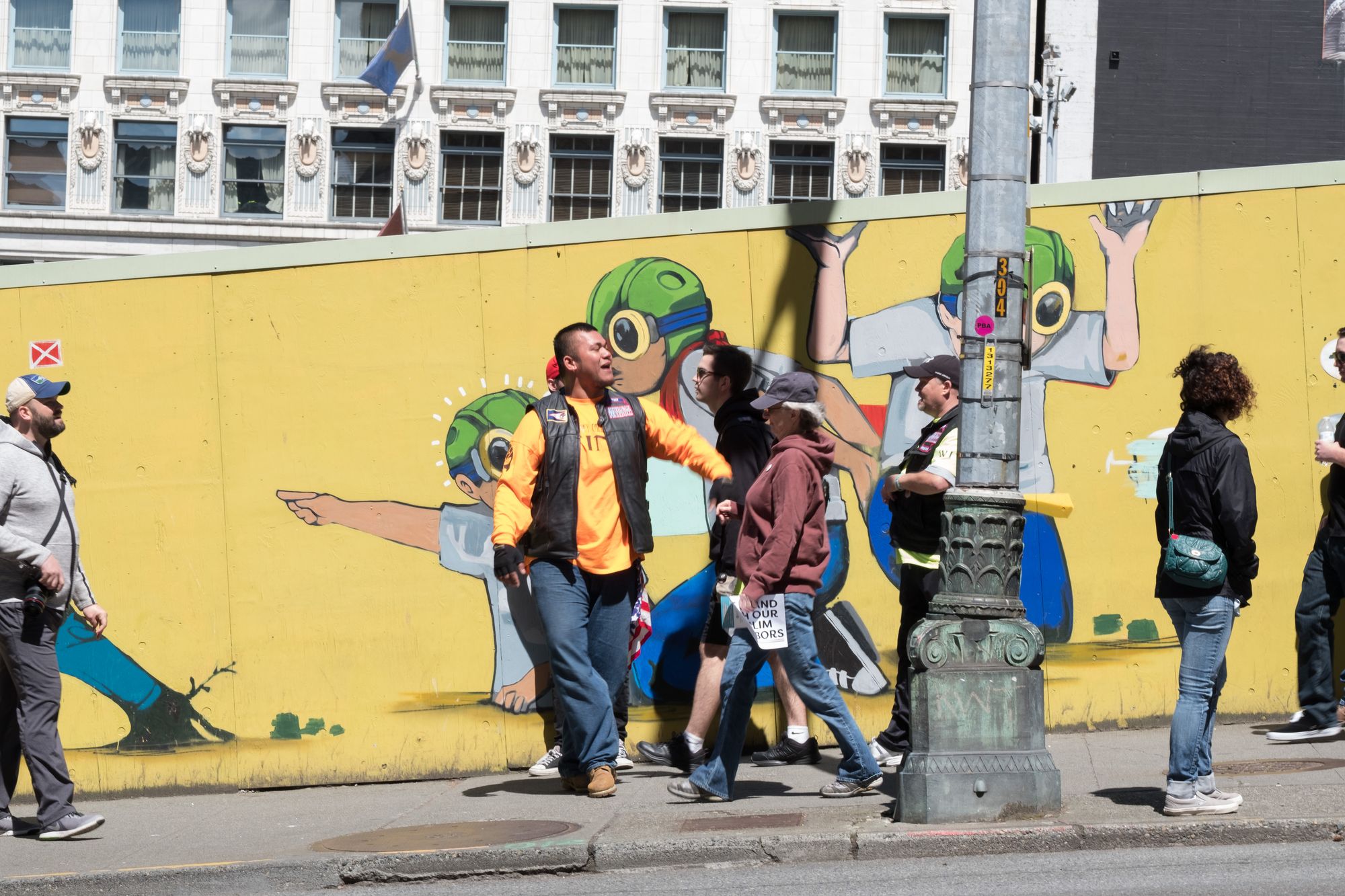 In June 2017 I took photos at a protest in Seattle. I can't remember the details, but I think it was a protest / counter-protest partially centered on a travel ban. Proud Boys and other pro-Trump groups were protesting in downtown Seattle, and counter-protesters gathered in response. There were a lot of pro- and anti-Islam signs.