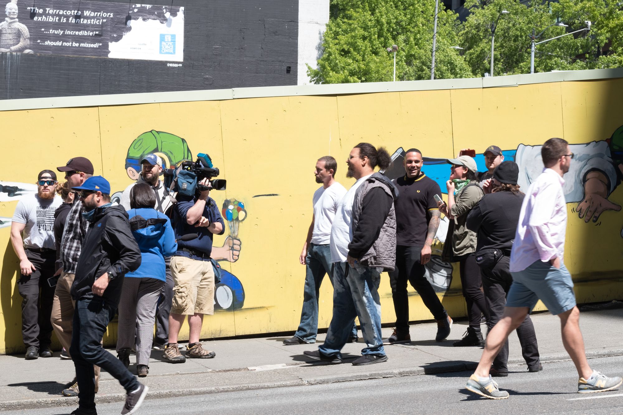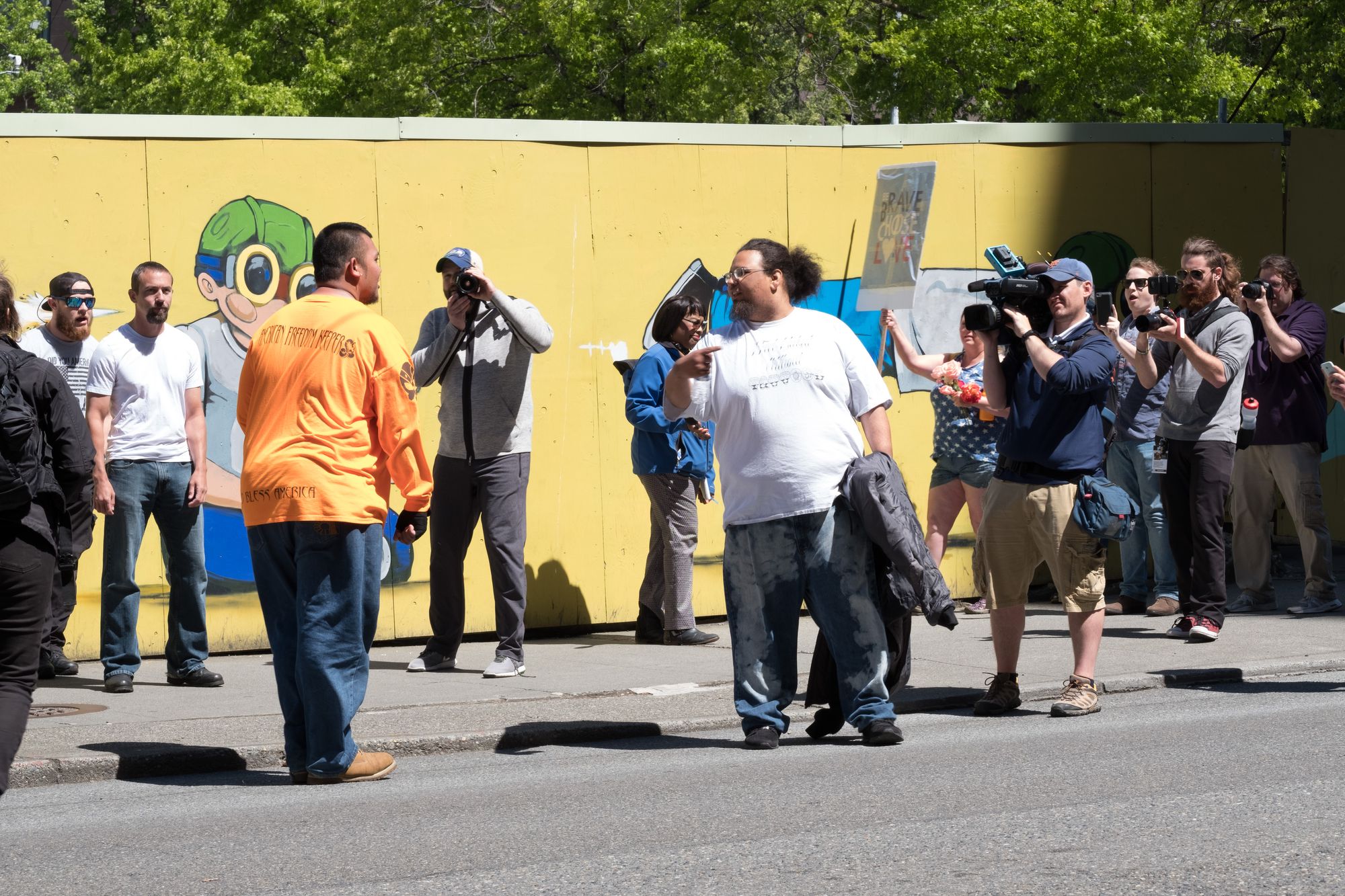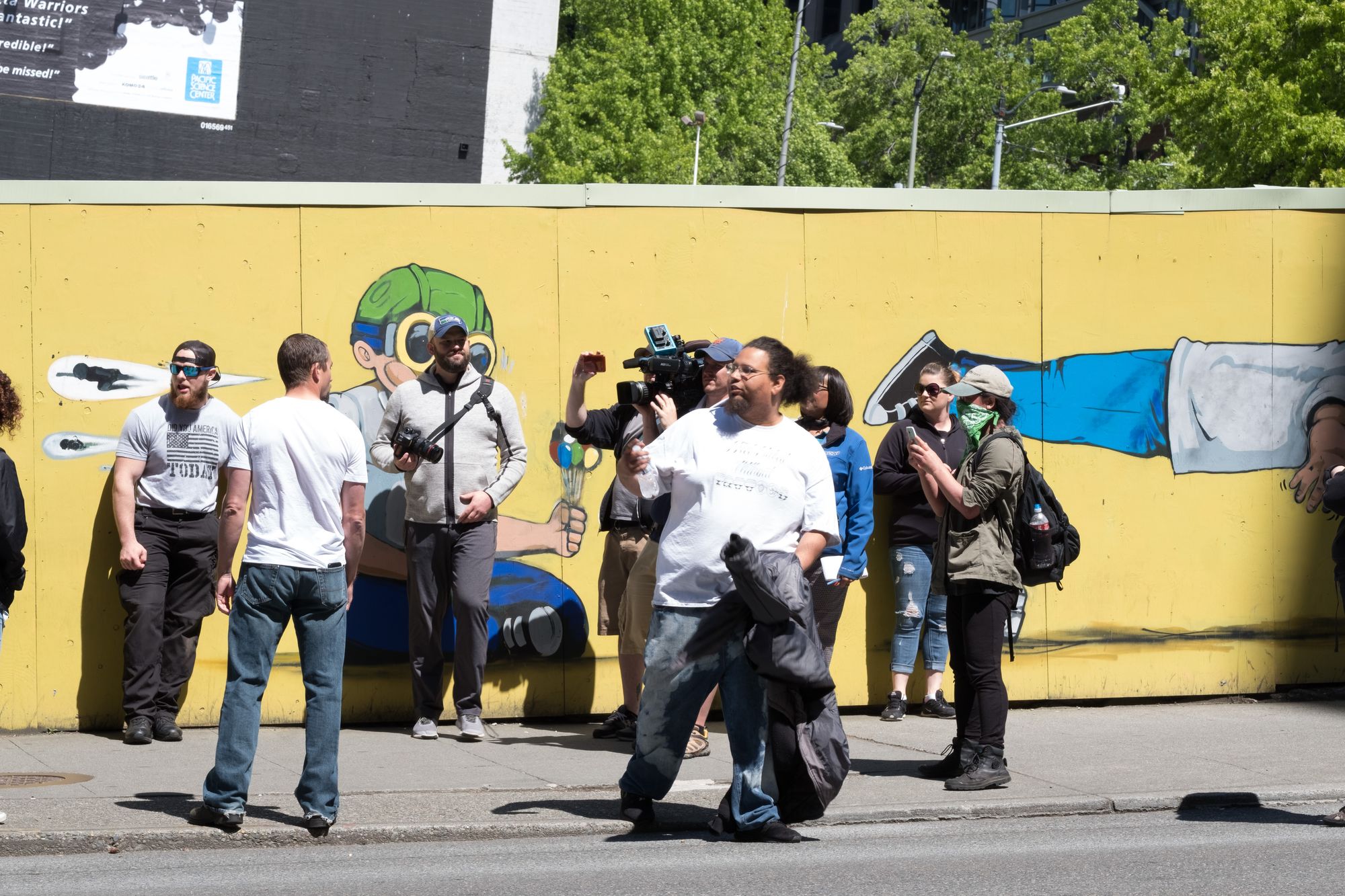 Groups of Proud Boys and other protesters would occasionally walk around the protest area. Tensions between protesters and counter-protesters increased on one of these walks. A fight nearly broke out.