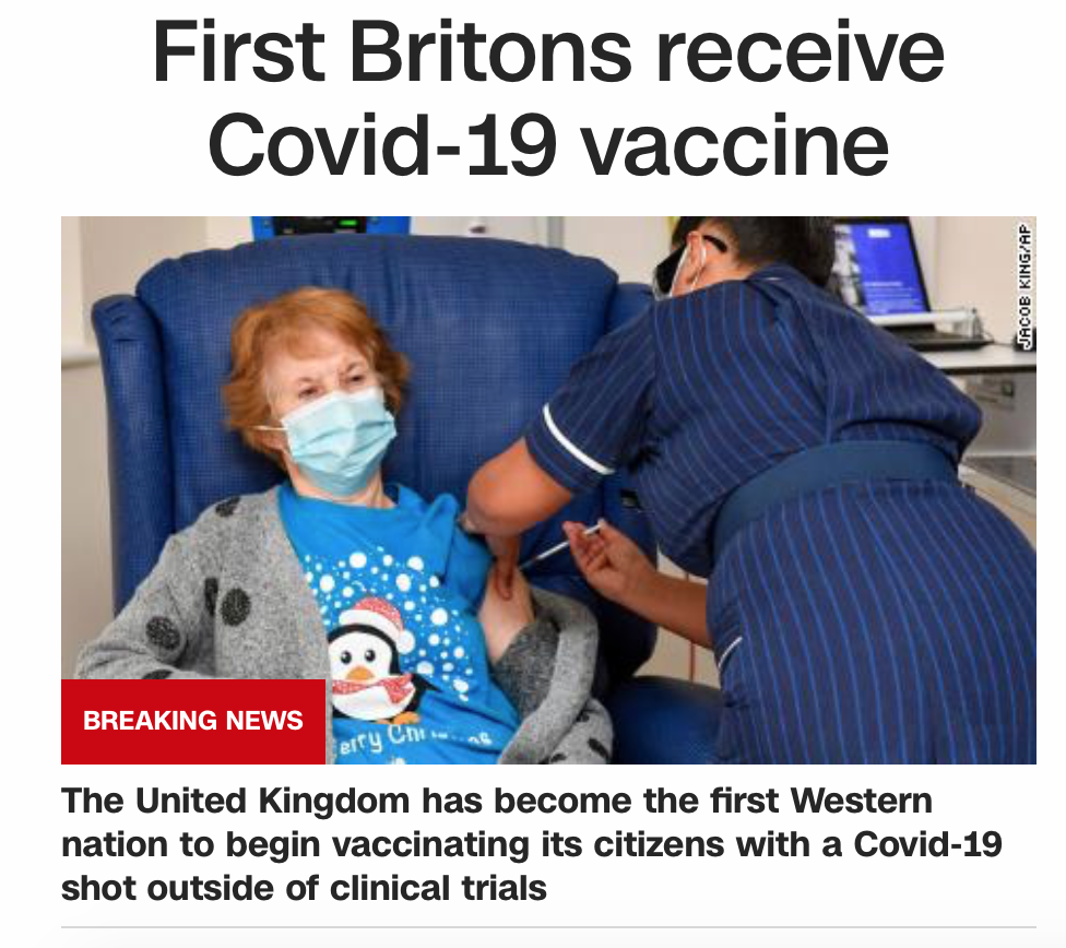 It's late (or early) here, and I made that internet-era mistake of "one more click". I opened CNN for some mindless information hoovering. But it wasn't just another day in the 24 hour news cycle. The main image and story showed Margaret Keenan, 90, getting the first non-trial public COVID vaccine in the UK.