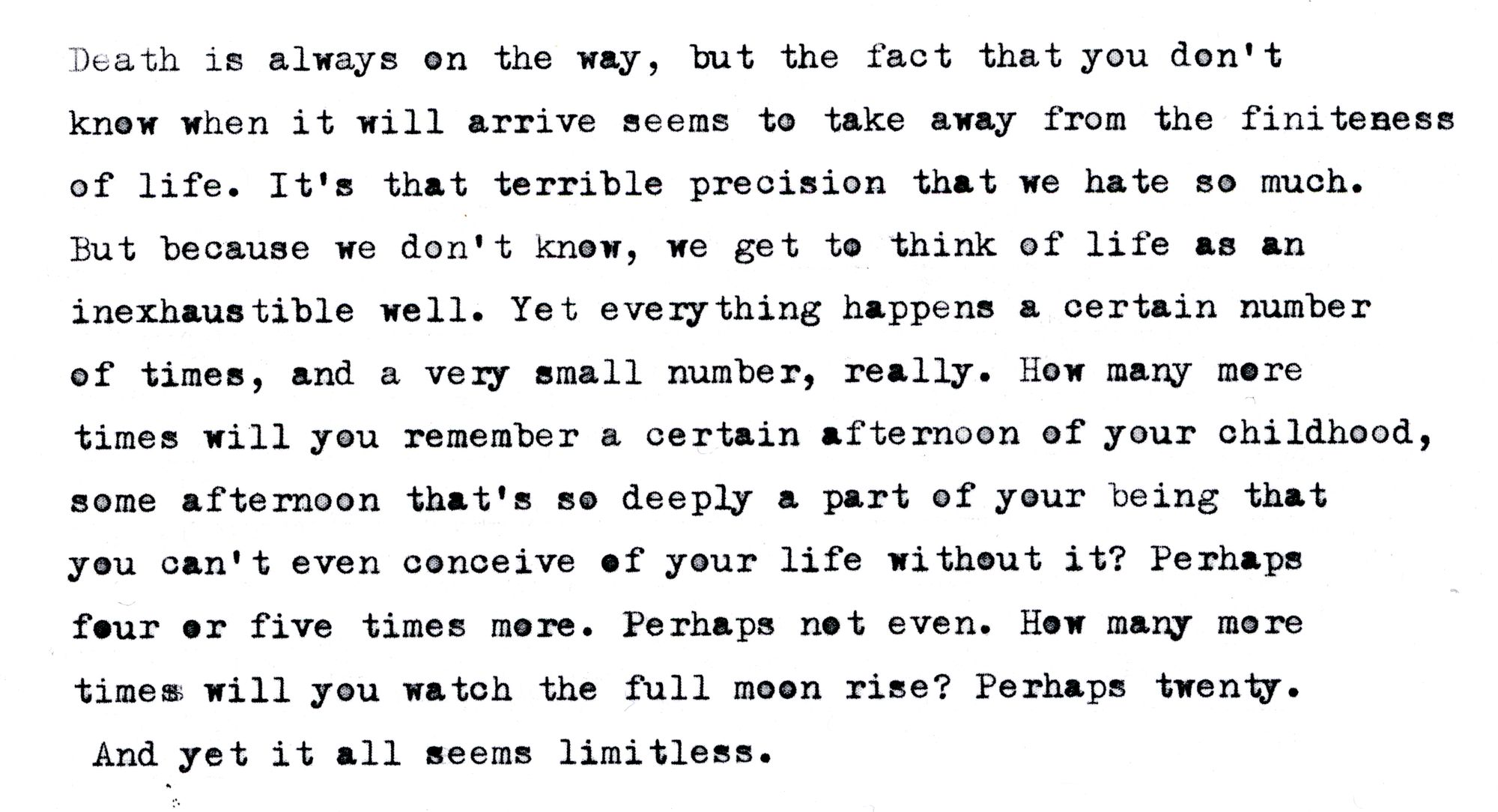 I typed out a quote from Paul Bowles to include in the journal. I think it's from The Sheltering Sky, but it might be a quote of his explaining The Sheltering Sky.